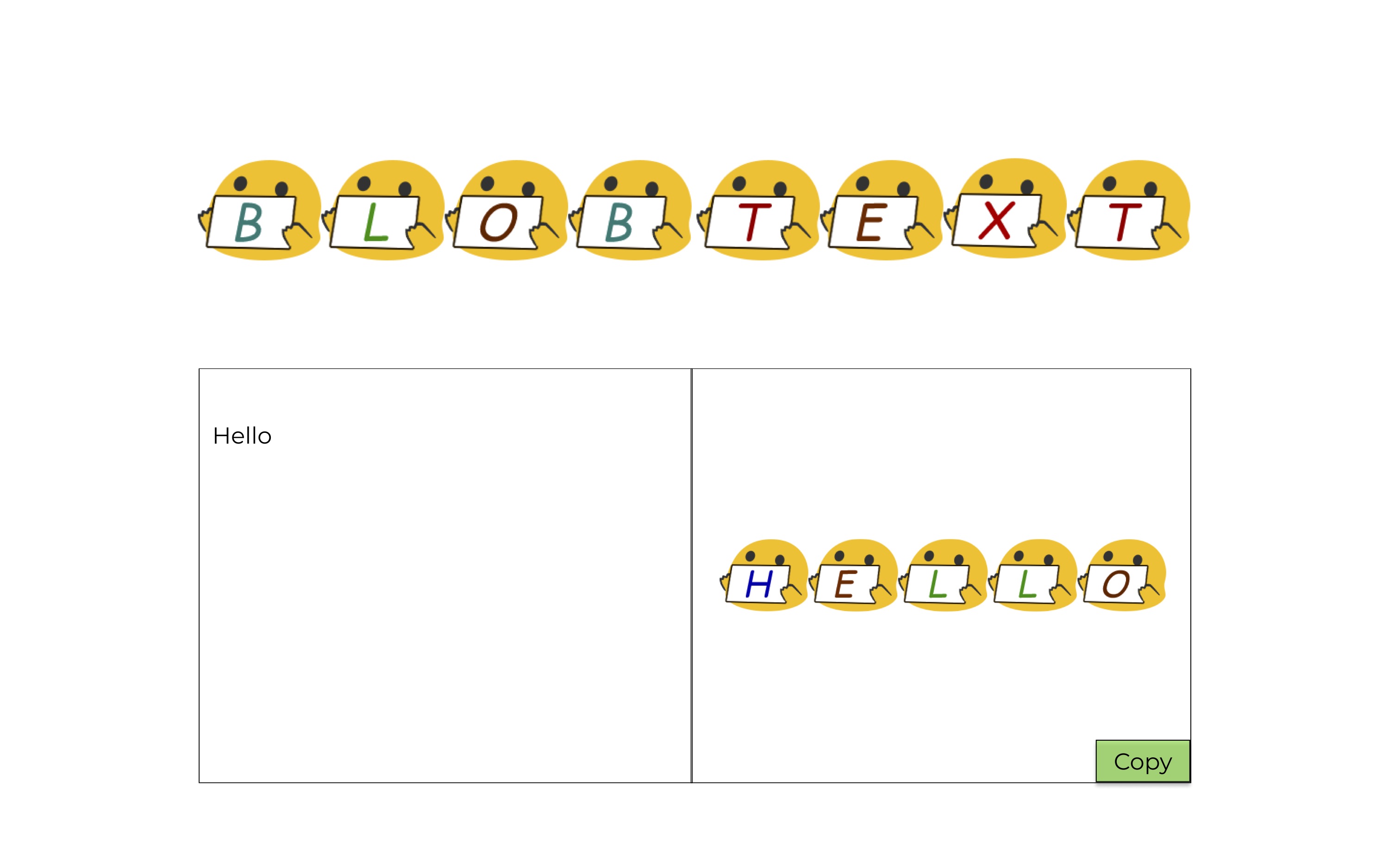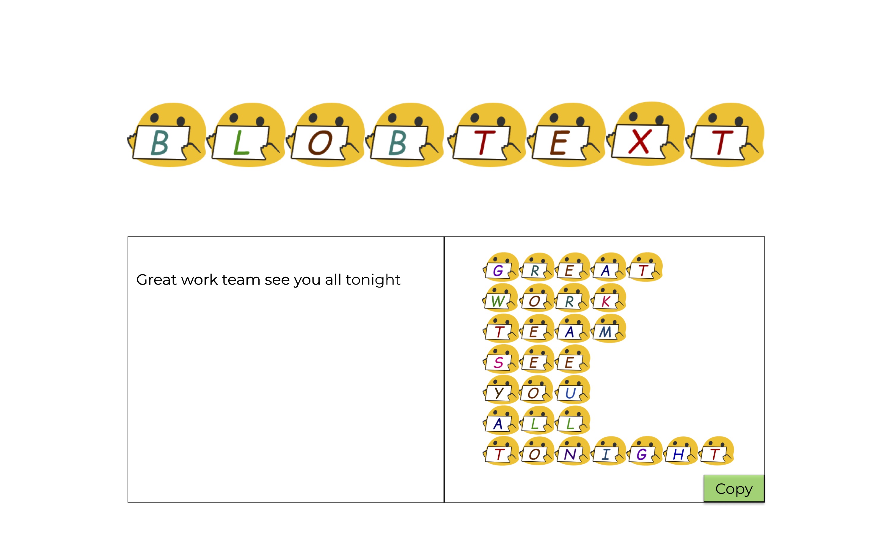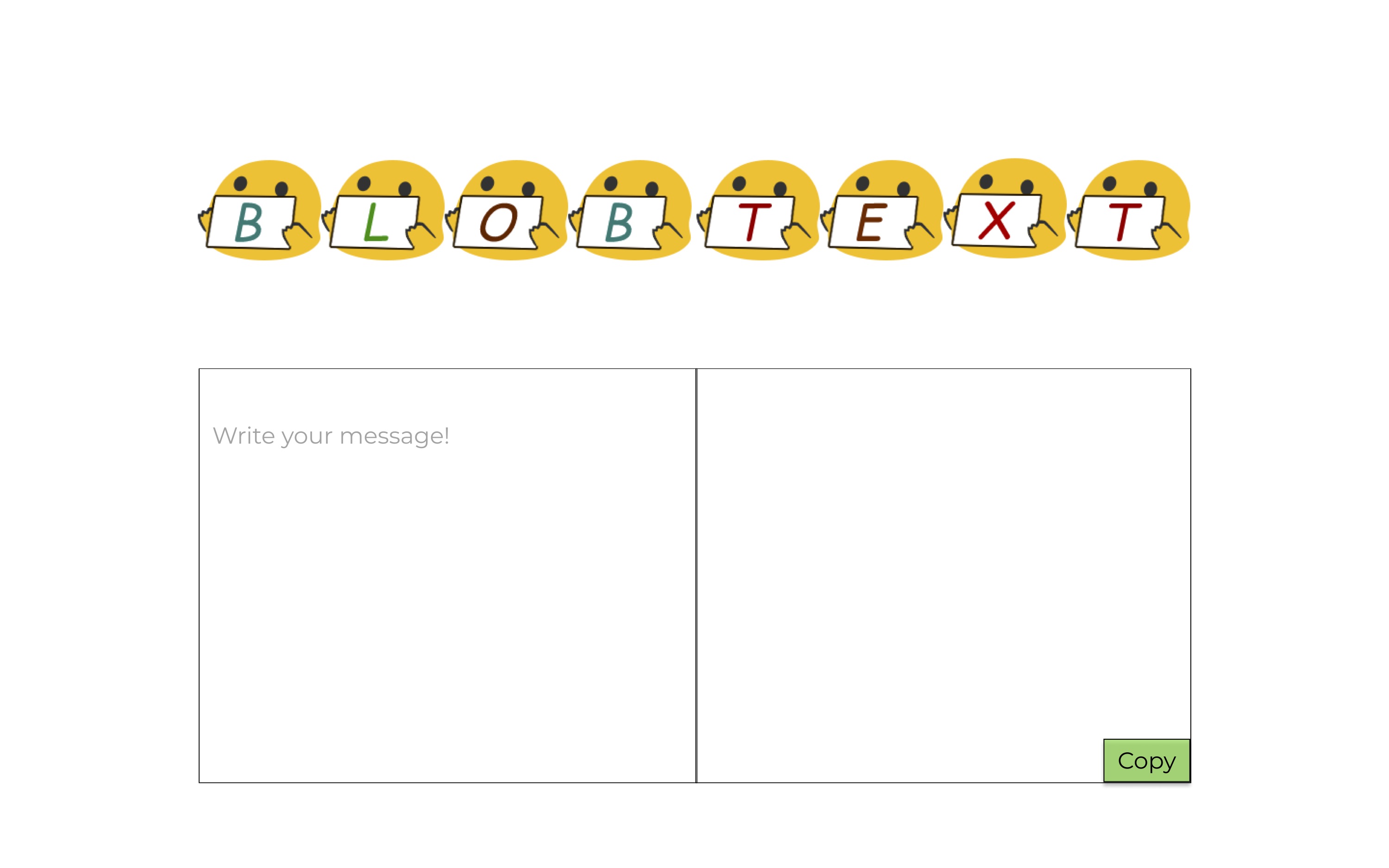 At the start of my internship at Slack, I quickly learned how much the people there love using emojis. There would be emojis in every single onboarding slide, welcome message, and of course, there were the reacjis. I then discovered the blobs, and I have to say I was obsessed. There were blobs holding up signs for every letter of the alphabet, so I had to write messages consisting of only blobs. My friend Daniel then came up with the idea of making a simple website to quickly generate these blob messages, because typing out the reacji names for each character was probably not the best use of the company's time. With BlobText, users can type out the message they wish to blobify, see what their message would look like, and copy the text that they can simply paste into channel.