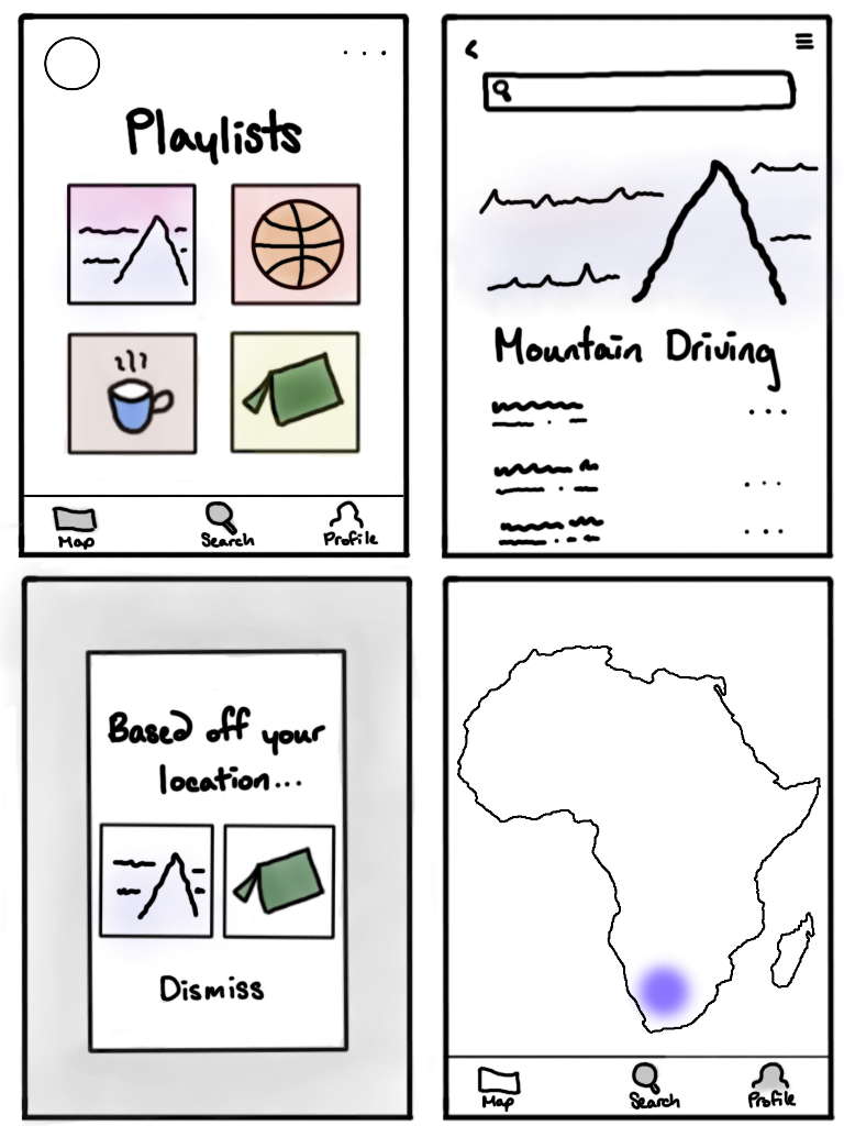 The music I listen to when I'm studying is different from what I listen to when I'm at the gym or going on a roadtrip. Cantabile would allow users to create playlists and pinpoint it to specific locations or areas on the map. If the user is listening to a playlist but enters an area that has been designated with a different playlist, a pop up will suggest that the user can quickly change their playlist, or dismiss the pop up if they wish to continue listening to their current playlist. There is also an exploratory and social aspect to this app, which allows users to find public playlists anywhere on the map so they can see what others in different or the same areas listen to.